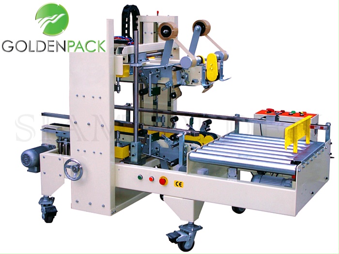 เครื่องปิดเทปกาวกล่องมุมกล่อง หรือที่รู้จักกันทั่วไปว่าเป็นเครื่องซีลปิดเทปกาวกล่อ หรือ เครื่องปิดผนึกกล่องด้วยเทปกาวโอพีพี ถูกออกแบบและผลิตมาเพื่อใช้งานสำหรับปิดเทปกาวกล่อง เครื่องปิดเทปกาวกล่องนี้ ช่วยให้ผู้ปฎิบัติงานสามารถปิดผนึกกล่องที่มีขนาดเท่ากันได้อย่างสะดวกและรวดเร็วด้วยตนเอง ความเร็วในการปิดเทปกาวมุมกล่อง สามารถทำงานได้เร็วสูงถึง 12-15 กล่อง/ นาที ขนาดในการซีลปิดเทปกาวกล่อง FJ-9L สามารถซีลปิดเทปกาวกล่องที่มีขนาด 480-2000มม. ความกว้าง 480-800 มม. และความสูง 40-320 มม. ขนาดตลับเทปกาวopp 60 มม. 75มม. โครงสร้างมีความแข็งแรงทนทาน, เหล็กเคลือบสี หรือ แบบสแตนเลสไร้สนิม