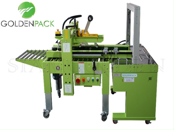 เครื่องปิดเทปกาวระบบลำเรียงกล่องเข้าเครื่องอัตโนมัติ ต่อกับเครื่องรัดกล่อง เครื่องปิดเทปกาว กล่องใช้สำหรับปิดเทปกาวกล่องลูกฟูก มีทั้งแบบกึ่งอัตโนมัติและแบบอัตโนมัติ แบบอัตโนมัติ สามารถใช้งานต่อกับไล์นผลิตอัตโนมัติได้ แบบกึ่งอัตโนมัติ จะเป็นการทำงานโดยจะใช้คนพับฝากล่องและดันกล่องเข้าสายพานเครื่อง