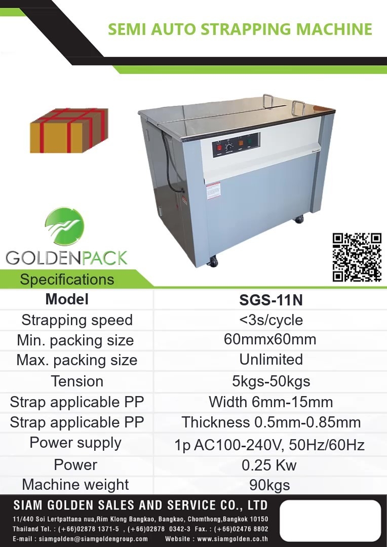 เครื่องรัดกล่องกึ่งอัตโนมัติ เครื่องแพ็คกล่องกึ่งอัตโนมัติ SGS-11N คือเครื่องรัดสายรัดพลาสติกสำหรับแพ็คกล่องสินค้า เครื่องรัดกล่องแบบมาตรฐาน เครื่องมีมาตรฐาน CE รับรอง ความเร็วในการทำงาน น้อยกว่า3วินที/รอบ ในการรัดสายรัด แรงดึงสูงสุด 50kgs. สามารถใช้ในการแพ็คกล่องสินค้าหรือกล่องบรรจุภัณฑ์ที่มีขนาดขั้นต่ำ ความกว้าง60มม. ความสูง60มม. ขึ้นไปโดยไม่จำกัดขนาดของกล่องบรรจุภัณฑ์สินค้า โดยใช้กับสายรัดที่มีขนาดความกว้างตั้งแต่ 6มม.-15มม. และความหนาของสายรัด 0.5มม.-0.85มม.
