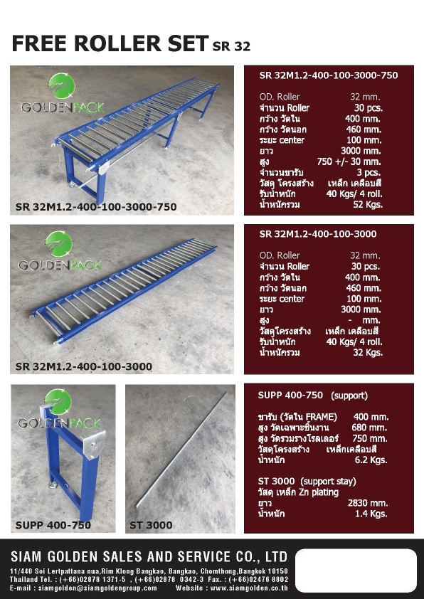 สายพานลำเลียง ลูกกลิ้งลำเลียง ทางตรง รุ่น SR 32m ขนาดลูกกลิ้ง 32mm. จำนวนลูกกลิ้ง 30 ชิ้น ความกว้างวัดด้านใน 400มม. ความกว้างวัดด้านนอก 460มม. ระยะห่าง 100มม. ความยาวสายพานลำเลียง 3000มม. ขนาดความสูง 75+/-30มม. จำนวนขารับน้ำหนัก 3ช่วง วัสดุโครงสร้าง เหล็กเคลือบสี รองรับน้ำนัก 40กิโลกรัม น้ำหนักโดยรวม 52กิโลกรัม