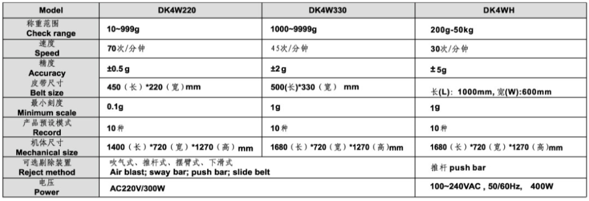 เครื่องตรวจสอบน้ำหนักแบบสายพานลำเลียง รุ่น DK4W คือเครื่องตรวจเช็คน้ำหนัก ที่ถูกออกแบบมาสำหรับกระบวนการบรรจุสินค้า บรรจุผลิตภัณฑ์อัตโนมัติ โดยสมบูรณ์เพื่อความแน่ใจว่าผลิตภัณฑ์จะมีน้ำหนักที่ได้มาตรฐาน ส่วนน้ำหนักที่มากเกิน หรือน้อยเกินไปจะถูกคัดออกจากสายการผลิตโดยอัตโนมัติ เมื่อตรวจสอบแล้วพบเจอสินค้าที่ไม่ได้น้ำหนักจะมีสัญญาณเตือนอัตโนมัติ