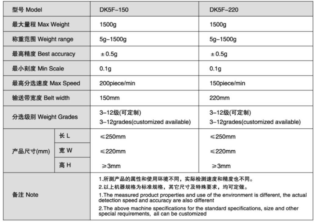 เครื่องชั่งน้ำหนักบนสายพาน DK5F คือเครื่องตรวจสอบน้ำหนักความเร็วสูง ถูกออกแบบมาเพื่อใช้ร่วมกับไลน์ผลิต ไลน์บรรจุอัตโนมัติ สามารถกำหนดรูปแบบและขนาดได้ตามความต้องการ เหมาะสำหรับอุตสาหกรรมต่างๆ รวมทั้งผลิตภัณฑ์อาหารแปรรูป เมื่อตรวจพบเจอผลิตภัณฑ์ที่มีน้ำหนักเกิน หรือ ผลิตภัณฑ์ที่มีน้ำหนักเบาไม่ตรงมาตรฐาน เครื่องจะทำการคัดแยกสินค้าออกจากสายพานลำเลียงสินค้าอัตโนมัติ และหากตรวจจับเจอสินค้าที่มีน้ำหนักมากหรือน้อยเป็นพิเศษจะมีสัญญาไฟเตือนเพื่อแจ้งให้ผู้ใช้งานรับทราบ