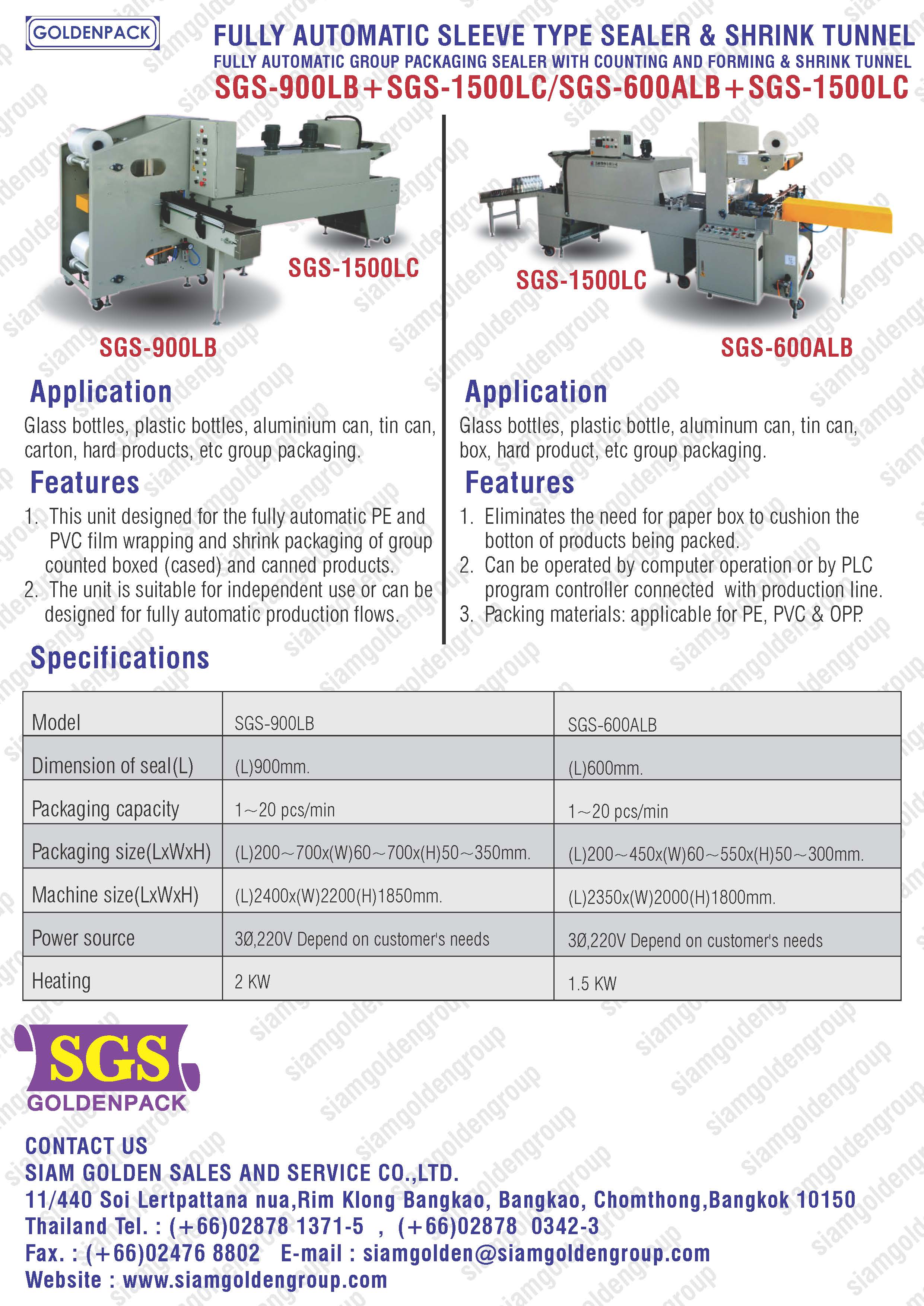 เครื่องซีลปิดปากถุงอัตโนมัติ เครื่องห่อฟิล์มหด SGS-900LB และ เครื่องอบฟิล์มหด อุโมงค์ลมร้อน SGS-1500LC ใช้สำหรับแพ็คโหลแพ็คหมู่บรรจุภัณฑ์ต่างๆ เช่น ขวดแก้ว, ขวดโหล, ขวดพลาสติก, ขวดกระป๋อง, กระป๋องอลูมิเนียม, กระป๋องโลหะ, กล่องลังกระดาษ, กล่องบรรจุภัณฑ์ ที่มีขนาด L 200-700 * W 60-700 * H 50-350มม.