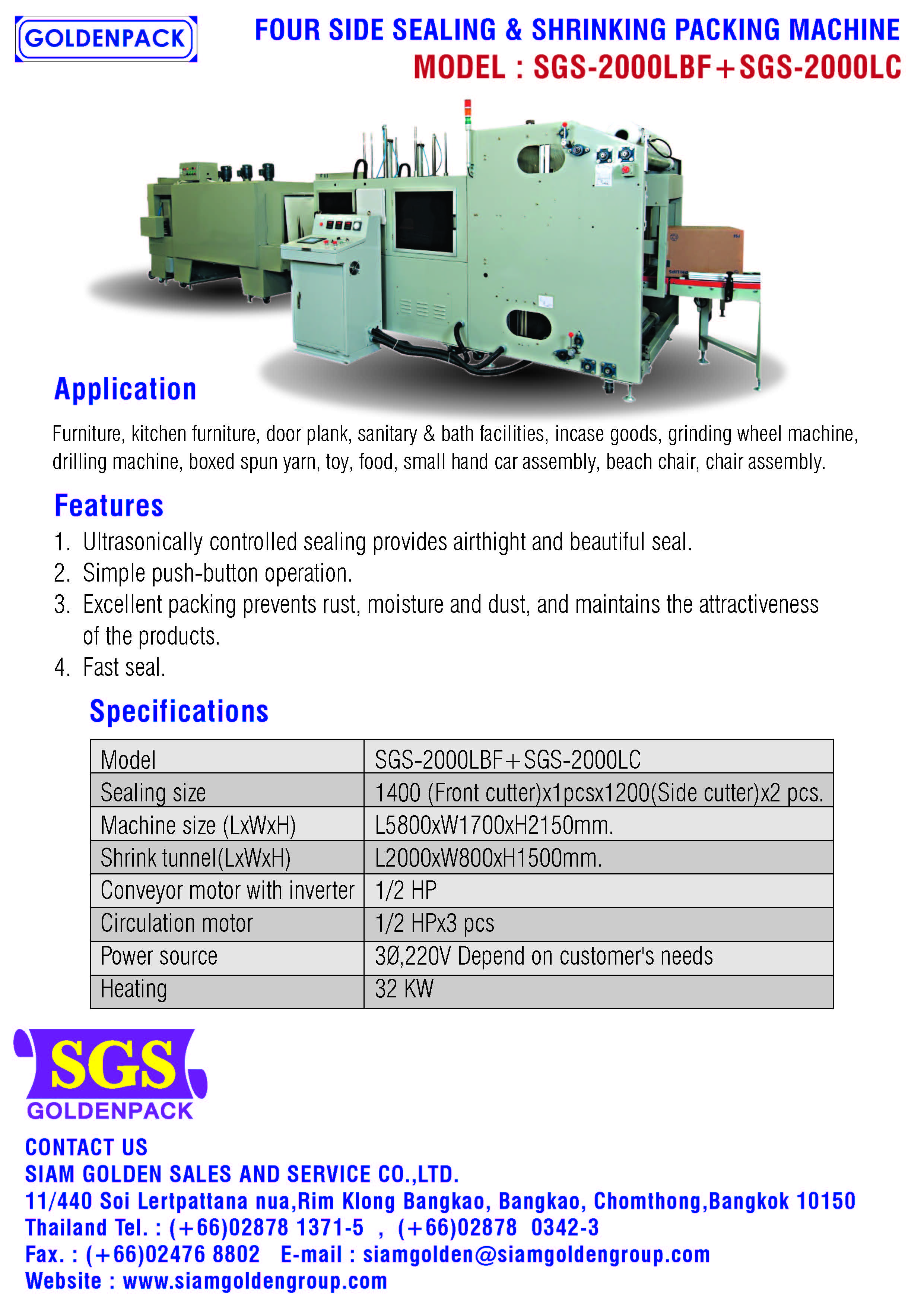 เครื่องซีลปิดปากถุงอัตโนมัติ เครื่องห่อฟิล์มหด SGS-2000LBF และ เครื่องอบฟิล์มหด อุโมงค์ลมร้อน SGS-2000LC ใช้สำหรับแพ็คโหลแพ็คหมู่บรรจุภัณฑ์ต่างๆ เช่น เฟอร์นิเจอร์, เฟอร์นิเจอร์แต่งบ้าน, เฟอร์นิเจอร์ครัว, ประตูไม้, หน้าต่าง, เครื่องสุขภัณฑ์, สิ่งอำนวจความสะดวกในห้องน้ำ, เครื่องบด, เครื่องเจาะ, กล่องบรรจุภัณฑ์, ของเล่น, ผลิตภัณฑ์อาหาร, ผลิตภัณฑ์ขนม, อุปกรณ์ประกอบรถ, อุปกรณ์แต่งรถ, เก้าอี้ชายหาด, ชุดเก้าอี้, แผ่นไม้, ผลิตภัณฑ์ที่มีขนาดความกว้าxความยาว xความใหญ่เป็นพิเศษและมีน้ำหนักมาก