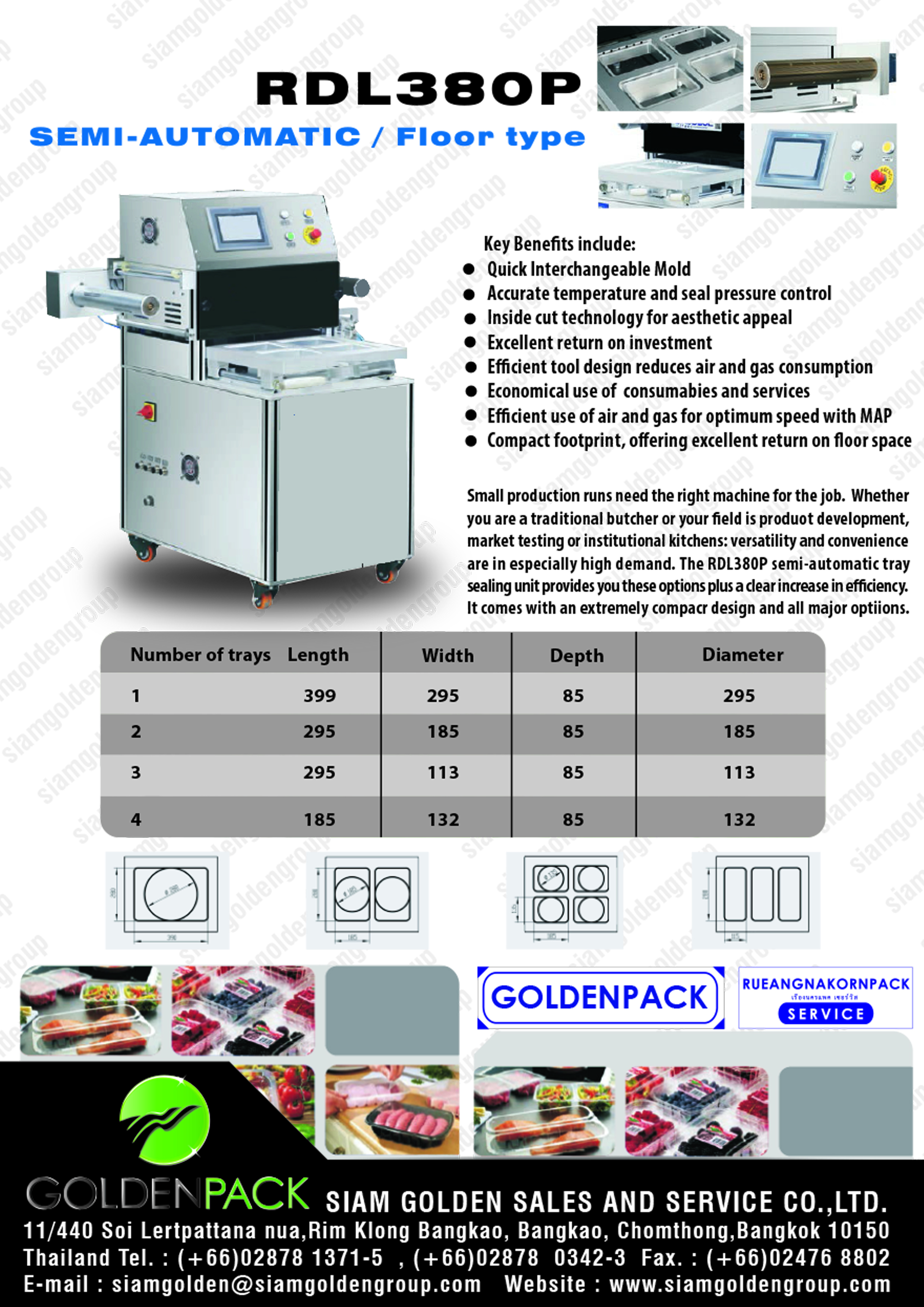 เครื่องซีลอาหาร เครื่องปิดถาดอาาหร RDT320 คือเครื่องบรรจุภัณฑ์ แพ็คสูญญากาศถาดอาหาร (ด้วยตนเอง) เครื่องซีลถาดสูญญากาศเหมาะสำหรับ อาหารแช่งแข็งและอาหารปรุงสุก ทั้งธุรกิจขนาดกลางและขนาดใหญ่ ความเร็วในการผลิต 300 กล่อง / ชั่วโมง