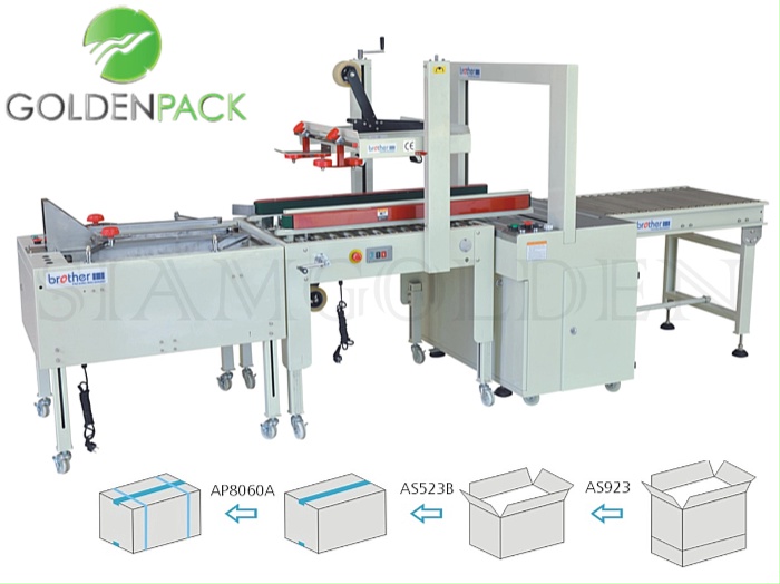 สยามโกลเด้น รับออกแบบระบบบรรจุภัณฑ์อัตโนมัติในสายการผลิต (automatic end of line packaging system) APL-CS10 คือ ระบบไลน์แพ็คกล่องอัตโนมัติ ไลน์บรรจุภัณฑ์ ไลน์แพ็คกล่องสินค้า ประกอบด้วยเครื่องขึ้นรูปกล่องพับฝากล่องด้านล่าง เครื่่องปิดเทปกาวพับฝากล่องด้านบน และเครื่องปิดเทปกาวมุมกล่องอัตโนมัติ